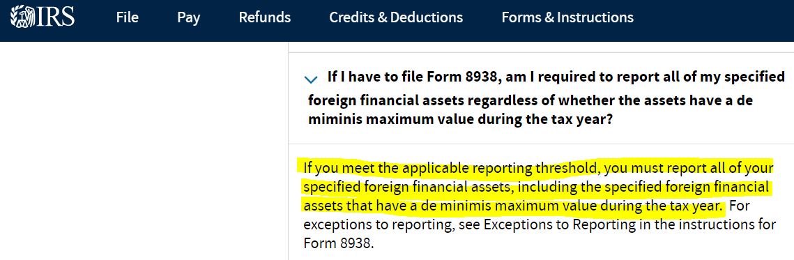 IRS는 FATCA 신고에 있어서 De-minimis exception 즉 최소한도 예외를 두지 않는다 공지하고 있습니다.