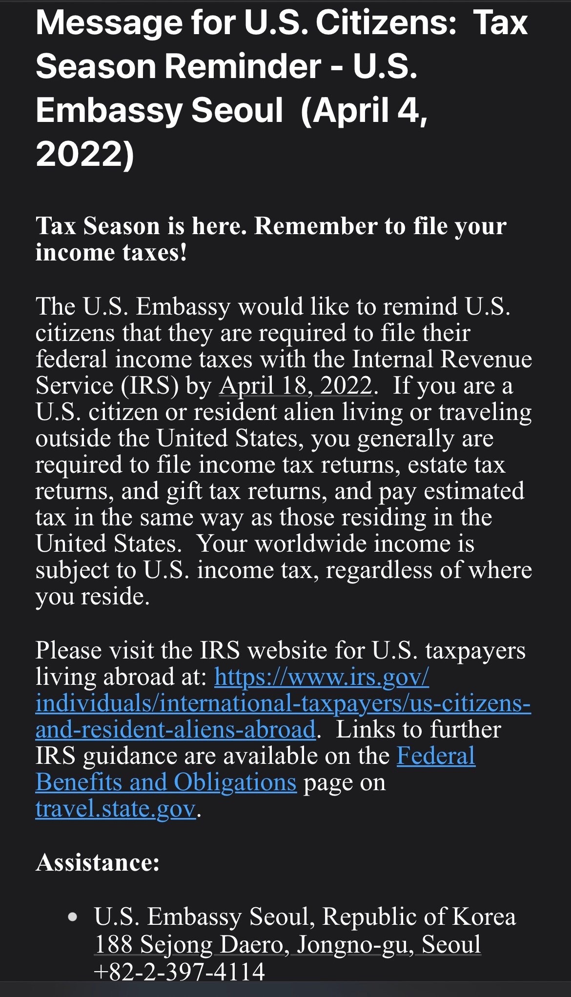 , 국내에 거주하는 미국인에게 미국대사관이 미국세금신고의무에 대한 안내 이메일을 발송하였습니다. 미대사관의 이러한 조치는 전례가 없던 일로 세금관련 문제는 미국세청 소관이라 일관하며 외국에 거주하는 자국민에게 세금관련 정보에 대한 홍보 안내는 소홀히 하였던 미외교부의 내부정책방향에 변화가 있었음을 시사하고 있습니다. 안내에서는 미국에 살지 않더라도 전세계소득을 미국국세청에 보고해야 함을 명확히 명시하며 소득세신고는 물론 상속, 증여신고 등에 대한 의무 또한 이행해야 함을 주지하고 있습니다.