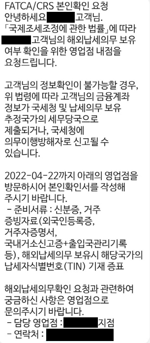 Letter 6185뿐만 아니라 최근들어 국내 금융기관에서 미국에 납세의무가 있을 같은 계좌소유인들에게 아래와 같은 문자를 보내고 있는데요. 한국금융기관에서 미국인 여부 식별 FATCA 법에 따른 보고대상자에 해당 경우 각종 계좌정보가 한국 국세청에 보고되며, 한국 국세청은 미국세청 IRS 정보를 매년 전자전송해주는 대신 미국세청으로부터 한국인 소유 미국금융계좌정보를 교환받게 됩니다. 결과적으로 해당 문자는 IRS 해외금융기관들을 통해 미국인 미국 국가에 자산있는 사람들을 파악 신고의무를 모두 이행했는지 사후적으로 조사할 정보수취 목적이 내재되어 있는 기초절차라고 이해할 있습니다. 과정에서 미국인으로 예상되는 계좌소유주가 해당 문자를 받고도 영업점을 방문하지 않아 은행에서 고객정보 확인 불가능한 경우에는 국제조세조정에 관한 법률에 따라 금융계좌 정보가 한국 국세청과 미국 국세청에 예외없이 제출될 있으며 한국국세청에 의무이행방해자로 신고될 있으니 주의해야 합니다.