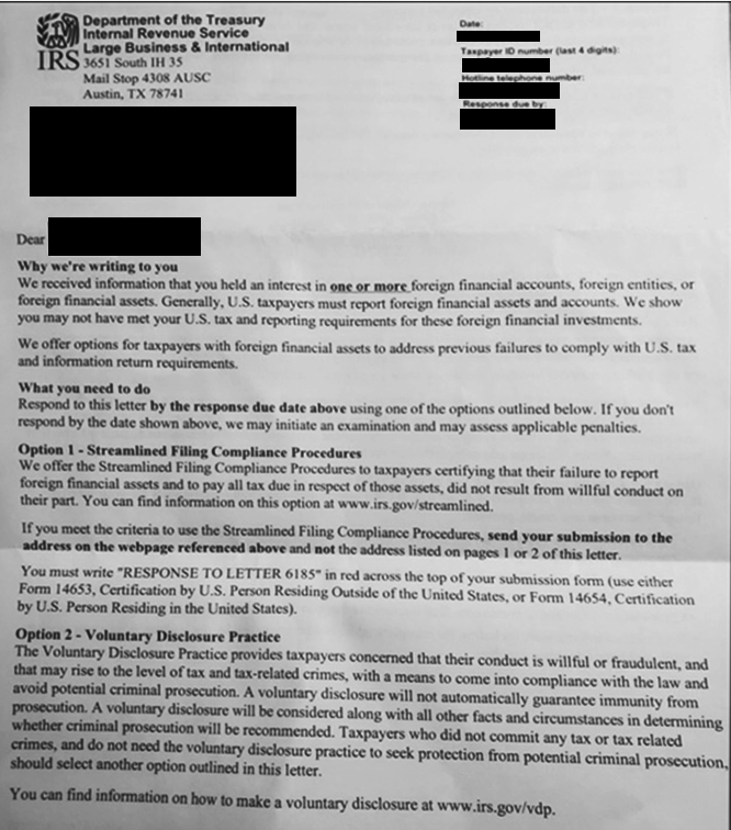 Letter 6185 미국인으로서의 해외소득, 자산, 증여등에 대한 각종 정보성 신고의무를 성실히 이행하지 않은 것으로 판단되는 경우 보내지는데요. 정보성 신고의무는 FBAR, FATCA, Form 5471(해외법인신고), Form 3520(증여수취신고서) 등을 뜻하며 신고대상자라면 본인이 신고한 내역에 대해 문제가 없음을 미국세청에 증명하라는 내용입니다. 여기서 중요한 점은 납세자가 통지서에 적힌 날짜까지 해외금융자산에 대한 신고의무를 모두 이행했음을 증명하지 못할 경우 IRS에서 세무조사를 시행하여 국가간정보교환협약에 따라 한국으로부터 획득한 3자정보와 대조, 누락된 계좌에 대해 예외없이 벌금을 부과할 있다는 입니다. 또한 통지서가 발행된 이후 공식적인 조사개시 레터를 받은 부터는 IRS 법적구제절차인 Streamlined Procedure 등을 이용할 없게 되어 벌금을 경감받는 통상적인 방법을 잃게 됩니다. 2019 이후 코로나 상황으로 인해 진행되지 못해왔던 FBAR/FATCA 신고의무관련 조사가 올해들어 점진적으로 개시되는 상황이니 신고누락, 계좌누락에 대해 본인이 관심을 가지고 선제적으로 대처하여야 것으로 판단됩니다.