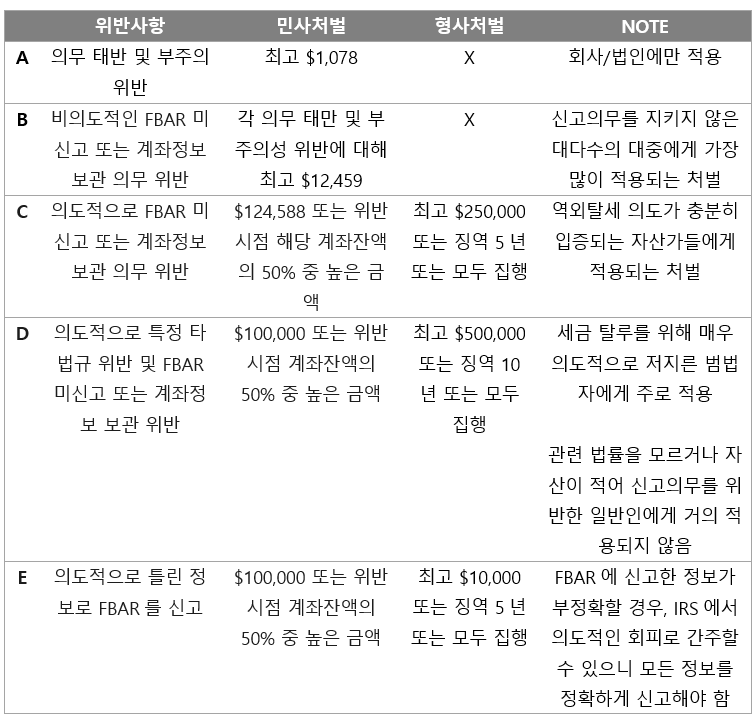 미국인으로서 FATCA 또는 FBAR 의무를 이행하지 않을 경우 민사처벌뿐만 아니라 형사처벌까지의 리스크가 존재합니다. FATCA의 경우 미신고된 계좌가 있거나 서식자체가 제출되지 않은 경우 $10,000 벌금이 부과되며 미국세청 적발 후 90일 이내로 제출하지 않을 시 30일 마다 벌금 $10,000 추가 (최대 $50,000) 됩니다. FBAR 벌금은 의무 위반 사항별 처벌이 다르며 전반적인 처벌은 아래 도표에서 확인 가능합니다.