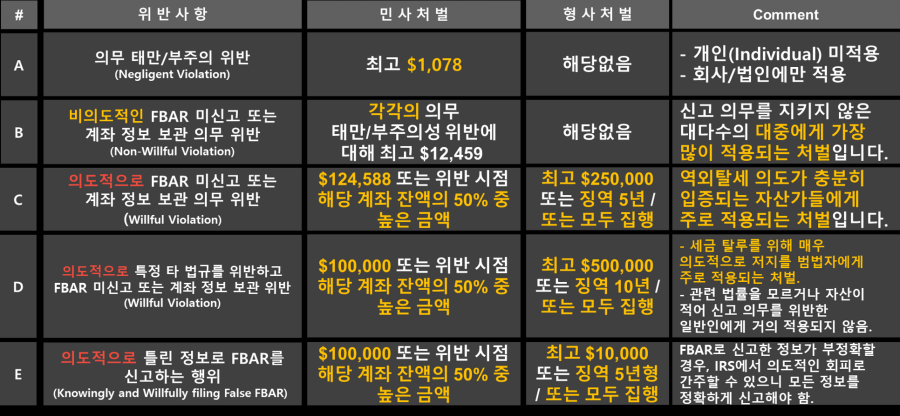먼저, FBAR 의무 위반 시 발생할 수 있는 처벌 내용(2017년 기준)을 아래와 같이 표로 정리해보았습니다(보다 쉽게 설명드릴 수 있도록 각 항목을 A~E로 구분해두었습니다). 이 중 대다수의 신고대상자분들께(혹시라도 신고의무를 다하지 않으셨다면!) 적용될법한 항목은 A, B, C로, 이번 글에서도 이 세가지 항목에 대해 자세히 살펴보고자 합니다.