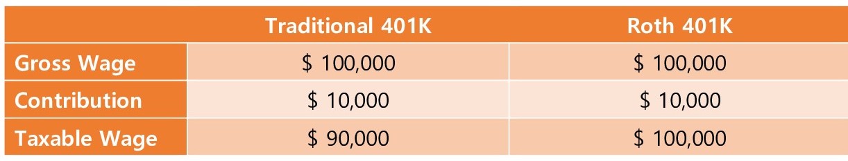 예를 들어 위 표와 같이 임금을 10만불을 받았을 때임금의 10% Traditional 401K Contribution 하였다면과세되는 임금은 Traditional 401K Contribution 만큼 제외하고 소득세에 포함됩니다이와 같이 Traditional 401K는 소득공제 혜택이 있는 대신은퇴 후 인출할 때원금 및 투자소득에 대해서 세금이 발생합니다.