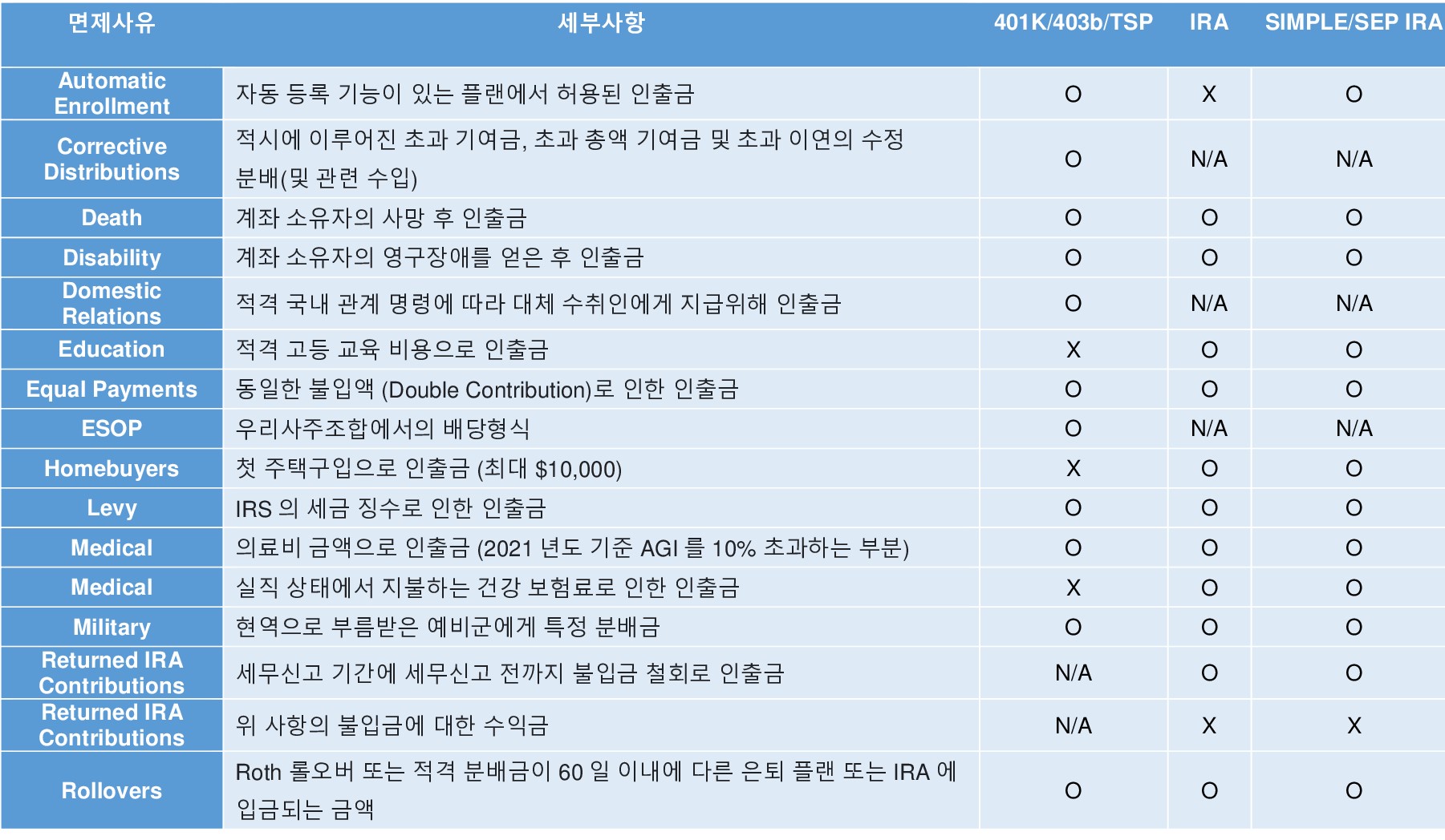 만약에 SEP IRA에서 59.5 세 이전에 인출하셔야 되는 경우 10% 페널티가 발생하며 퇴직저축 계좌에 개설한지 2년 이하인 시점에서 인출 시 10% 페널티가 아니는 25% 페널티가 부과된다는 점 유의 바랍니다 (페널티 면제조항 있음).