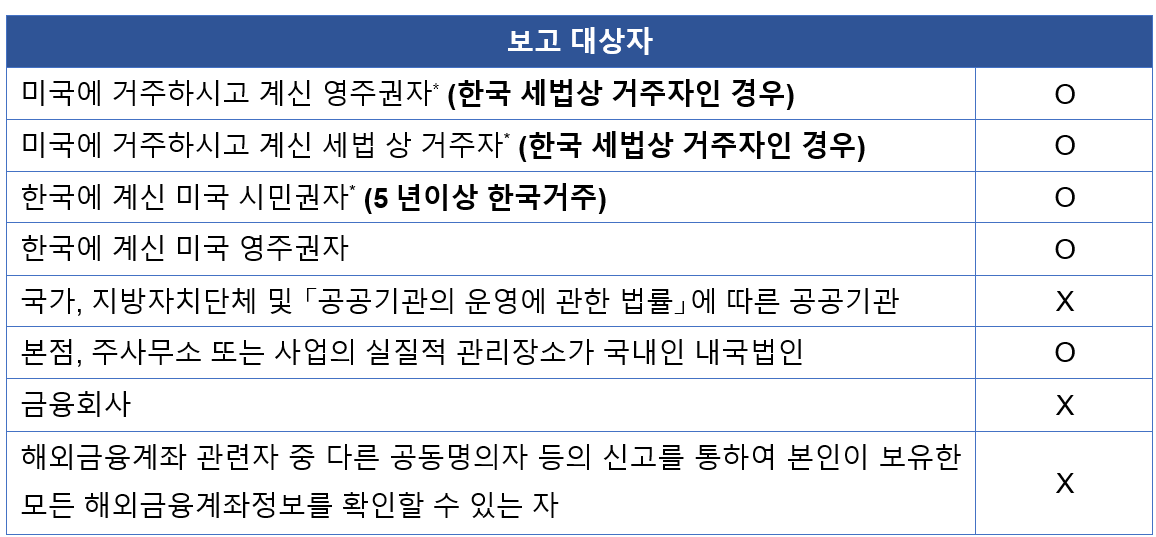 * 소급 10년간 주소 또는 거소를 둔 기간이 5년 이하인 ‘외국인’ (즉, 이중국적이 아닌 미국시민권자)는 보고에서 예외: 한국거주