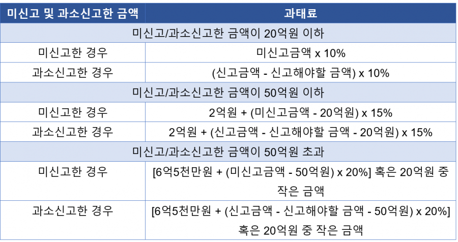 과태료부과 외에 미신고 또는 과소신고 금액이 50억원을 초과하는 경우, 인적사항 및 신고의무 위반금액 등을 공개하거나 2년 이하의 징역 또는 신고의무 위반금액의 13-20%에 상당하는 벌금에 처할 수 있습니다.